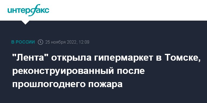 Москва. 25 ноября. INTERFAX.RU - Гипермаркет "Лента" в Томске, который пострадал при пожаре в декабре 2021 года, возобновил свою работу после реконструкции, говорится в сообщении компании.