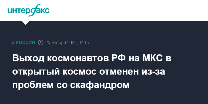 Москва. 25 ноября. INTERFAX.RU - В ходе подготовки российских космонавтов на Международной космической станции к выходу в открытый космос была обнаружена нештатная работа насосов в системе охлаждения одного из скафандров, принято решение об отмене работ, сообщили в "Роскосмосе".