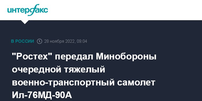 Москва. 28 ноября. INTERFAX.RU - Филиал ПАО "Ил" - Авиастар" (входит в Объединенную авиастроительную корпорацию "Ростеха") изготовил и передал очередной серийный тяжелый военно-транспортный самолет Ил-76МД-90А, построенный в интересах министерства обороны РФ, сообщает Ростех.