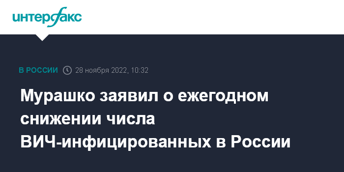 Москва. 28 ноября. INTERFAX.RU - В России в настоящее время проживает более 850 тыс. людей с вирусом иммунодефицита человека (ВИЧ); в стране отмечается устойчивый тренд по ежегодному снижению числа новых больных, сообщил министр здравоохранения РФ Михаил Мурашко.