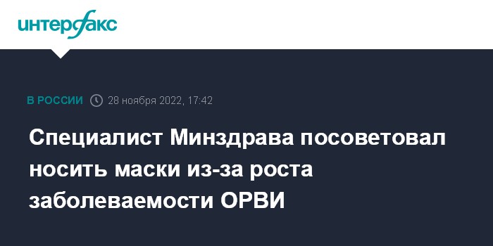 Москва. 28 ноября. INTERFAX.RU - Из-за увеличения в последние дни числа заболевших ОРВИ в России в местах большого скопления людей рекомендуется носить маски или респираторы, в первую очередь лицам из групп риска, сообщил главный внештатный специалист Минздрава России по инфекционным болезням Владимир Чуланов.