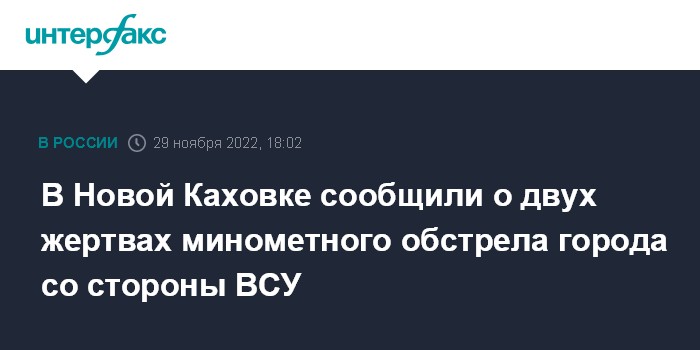 Москва. 29 ноября. INTERFAX.RU - Город Новая Каховка на левой стороне Днепра в Херсонской области во вторник подвергся минометному обстрелу со стороны ВСУ, два человека погибли, сообщили в администрации Новокаховского городского округа.