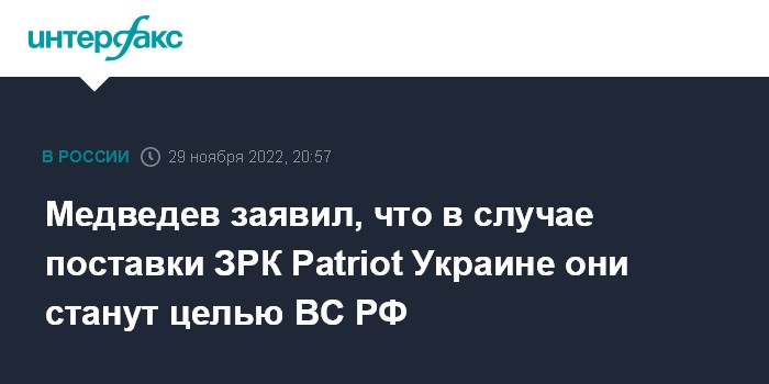 Москва. 29 ноября. INTERFAX.RU - Зампредседателя Совета безопасности России Дмитрий Медведев предупредил, что в случае поставки Украине зенитных ракетных комплексов Patriot они станут целью Вооруженных сил РФ.