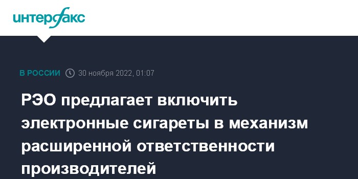 Москва. 30 ноября. INTERFAX.RU - Электронные сигареты следует включить в перечень товаров, подлежащих переработке в рамках расширенной ответственности производителей (РОП), заявил в среду гендиректор Российского экологического оператора (ППК "РЭО") Денис Буцаев.
