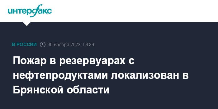 Москва. 30 ноября. INTERFAX.RU - Сотрудникам пожарно-спасательных подразделений удалось локализовать пожар в резервуарах с нефтепродуктами в Брянской области, сообщил губернатор региона Александр Богомаз в среду.