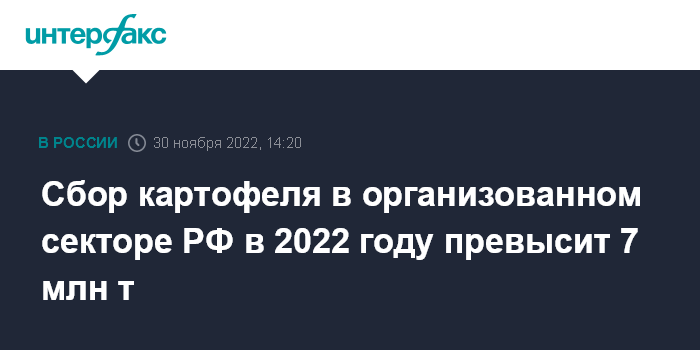Москва. 30 ноября. INTERFAX.RU - Сбор картофеля в организованном секторе РФ этом году может превысить 7 млн тонн, это больше, чем в прошлом году. Об этом сообщила первый замминистра сельского хозяйства Оксана Лут на пресс-конференции в среду в Москве.