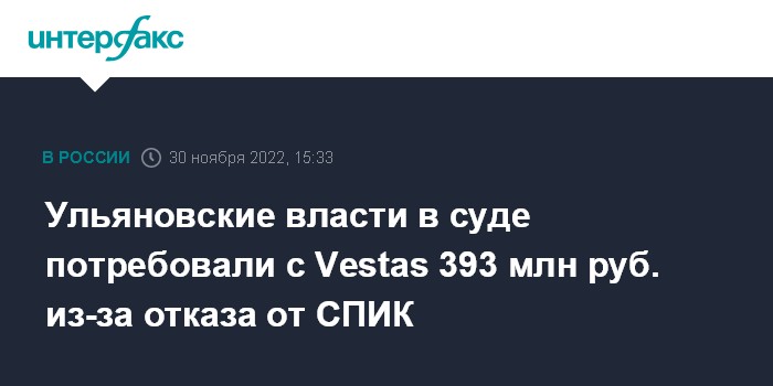 Москва. 30 ноября. INTERFAX.RU - Ульяновская область взыскивает через суд с ООО "Вестас Мэньюфэкчуринг Рус" (структура датской Vestas) 393 млн рублей недополученных доходов в связи с отказом компании от реализации специнвестконтракта (СПИК), заключенного в 2018 году.