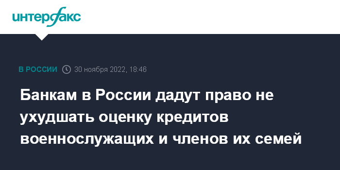 Москва. 30 ноября. INTERFAX.RU - Банк России даст право кредитным организациям не ухудшать оценку кредитов военнослужащих и их семей, готовит соответствующее информационное письмо, говорится в сообщении на сайте регулятора.