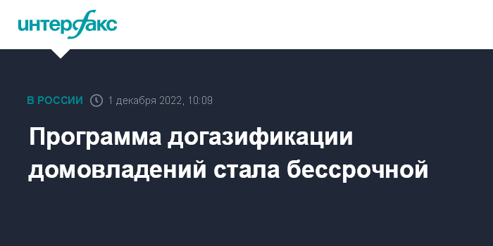 Москва. 1 декабря. INTERFAX.RU - Программа социальной газификации, в рамках которой бесплатно догазифицируются домовладения граждан, продлевается – становится бессрочной.