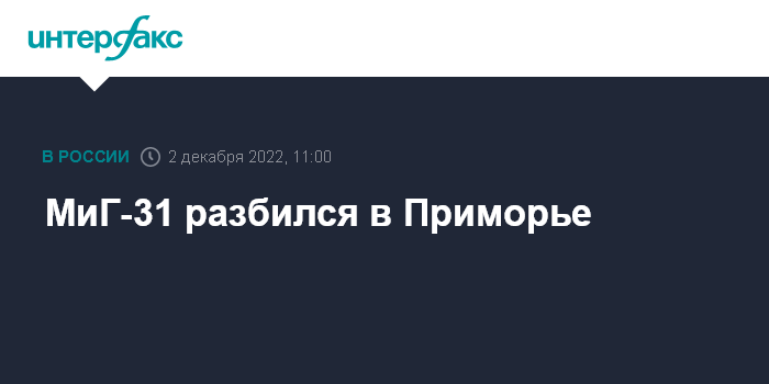 "2 декабря в Приморском крае во время выполнения планового учебно-тренировочного полета потерпел аварию самолет МиГ-31. Экипаж катапультировался. Полет выполнялся без боекомплекта", - говорится в сообщении.