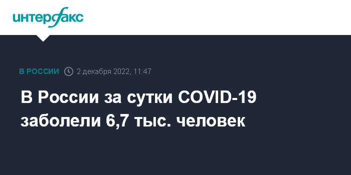 Москва. 2 декабря. INTERFAX.RU - Суточный прирост новых заболевших коронавирусом в России составил более 6,7 тысячи случаев, скончались 57 пациентов с COVID-19, следует из данных оперативного штаба, обнародованных в пятницу.
