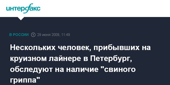 Москва. 29 июня. INTERFAX.RU - Петербургские медики проверяют на наличие вируса А/H1N1 нескольких человек, прибывших в северную столицу на круизном лайнере. "Обследуется ситуация, пока поступающие данные разнятся, в том числе и по количеству человек", - сообщил "Интерфаксу" источник в медицинских кругах, отметив, что медики уже работают на лайнере. "Никто на берег с температурой не выйдет", - подчеркнул собеседник агентства.