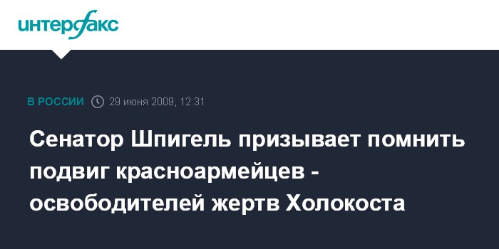 "Донесение неискаженной правды о событиях XX в. должно стать составной частью усилий международного сообщества по сохранению памяти о Холокосте, его жертвах и их освободителях - солдат Красной армии, спасших мир от коричневой чумы фашизма", - заявил Шпигель на проходящей в Праге международной конференции по вопросам имущества жертв Холокоста