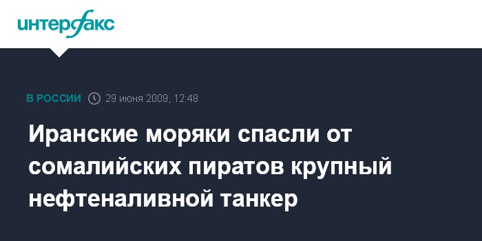 Москва. 29 июня. INTERFAX.RU - Иранский корабль, несущий боевое дежурство в Аденском заливе, спас от нападения сомалийских пиратов один из самых больших иранских нефтеналивных танкеров, передает в понедельник иранский англоязычный телеканал "Пресс-ТВ".