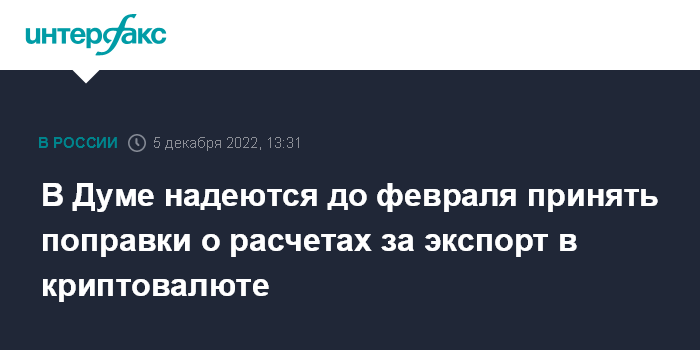 Москва. 5 декабря. INTERFAX.RU - Поправки в закон об экспериментальных правовых режимах (ЭПР), которые позволят российским компаниям рассчитываться за экспортные поставки в криптовалюте, могут быть приняты до конца января, заявил на форуме "Криптовалюты, майнинг и цифровые активы" глава комитета Думы по финансовому рынку Анатолий Аксаков.