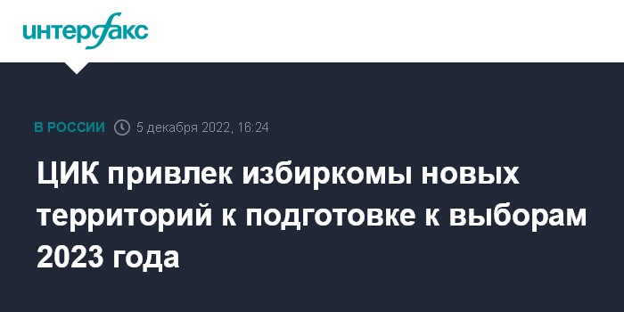 Москва. 5 декабря. INTERFAX.RU - Центризбирком России и региональные избирательные комиссии ЛНР, ДНР, Запорожской и Херсонской областей начали подготовку к проведению выборов в этих регионах в 2023 году, сообщил замглавы ЦИК Николай Булаев. Его слова приводит сайт комиссии.