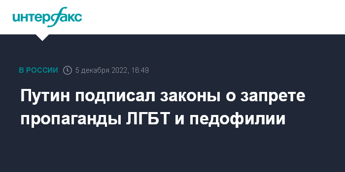 Москва. 5 декабря. INTERFAX.RU - Президент РФ Владимир Путин подписал законы о запрете пропаганды ЛГБТ, пропаганды педофилии, а также демонстрации ЛГБТ-информации и информации, побуждающей к смене пола среди подростков - они опубликованы на официальном интернет-портале правовой информации.