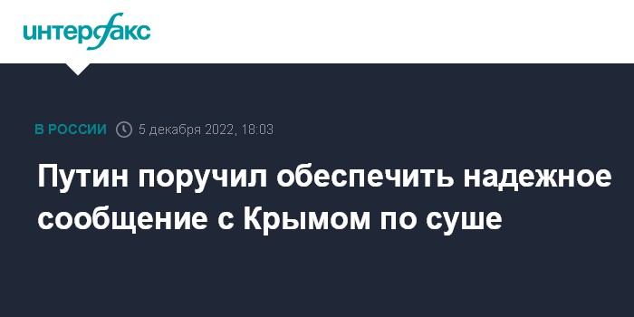 Москва. 5 декабря. INTERFAX.RU - Президент РФ Владимир Путин поставил задачу обеспечить надежное сообщение с Крымом по суше.