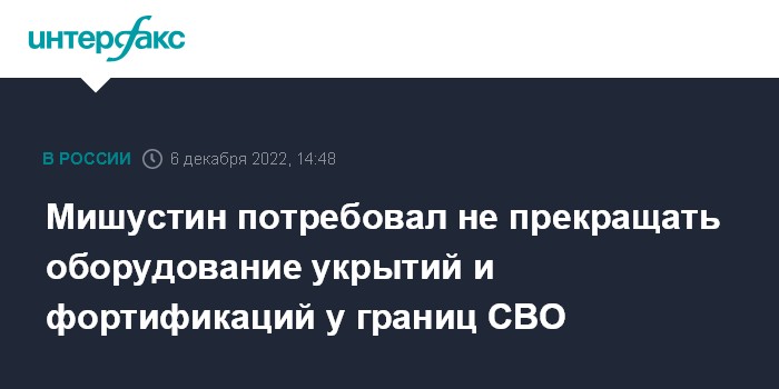 Москва. 6 декабря. INTERFAX.RU - В зоне проведения СВО и у ее границ даже зимой не должно прекращаться восстановление инфраструктуры и строительство укреплений, заявил на заседании координационного совета при правительстве по обеспечению нужд армии премьер-министр Михаил Мишустин.