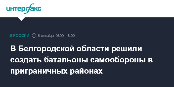 Москва. 6 декабря. INTERFAX.RU - Белгородский губернатор Вячеслав Гладков во вторник сообщил о решении сформировать батальоны самообороны из жителей области.