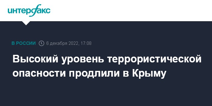 "С целью обеспечения безопасности и антитеррористической защищенности Республики Крым и ее граждан на территории ряда муниципальных образований и объектах республики с 20:00 7 декабря 2022 года до 20:00 22 декабря 2022 года будет действовать высокий ("желтый") уровень террористической опасности", - написал Аксенов в своем телеграм-канале.