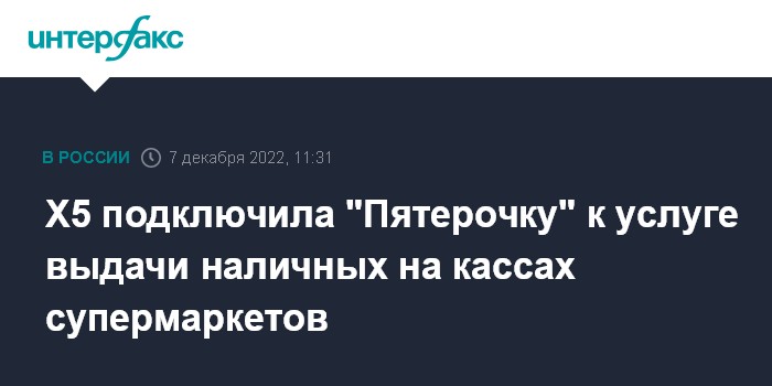Москва. 7 декабря. INTERFAX.RU - X5 Group подключила "Пятерочку" к выдаче наличных по банковской карте на кассах торговой сети, говорится в сообщении группы.