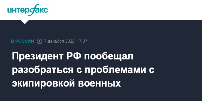Москва. 7 декабря. INTERFAX.RU - Президент РФ Владимир Путин пообещал решить проблемы с экипировкой военнослужащих, если до сих пор остаются какие-либо вопросы.