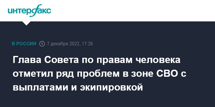 Москва. 7 декабря. INTERFAX.RU - Совет при президенте РФ по развитию гражданского общества и правам человека (СПЧ) зафиксировал ряд проблем в ходе проведения специальной военной операции, в том числе с выплатами мобилизованным, однако они не являются массовыми, заявил в среду председатель СПЧ Валерий Фадеев.