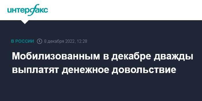 Москва. 8 декабря. INTERFAX.RU - Мобилизованные граждане в декабре текущего года получат денежное довольствие дважды, сообщила заместитель министра обороны РФ Татьяна Шевцова в четверг.