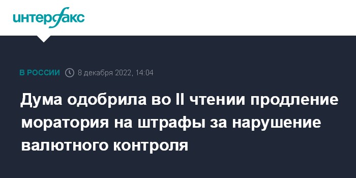 Москва. 8 декабря. INTERFAX.RU - Госдума приняла во втором чтении закон, который продлевает до 31 декабря 2023 г. применяемый сейчас к резидентам РФ (компаниям и гражданам) мораторий на привлечение к административной ответственности за ряд нарушений валютного законодательства, если они вызваны санкциями.