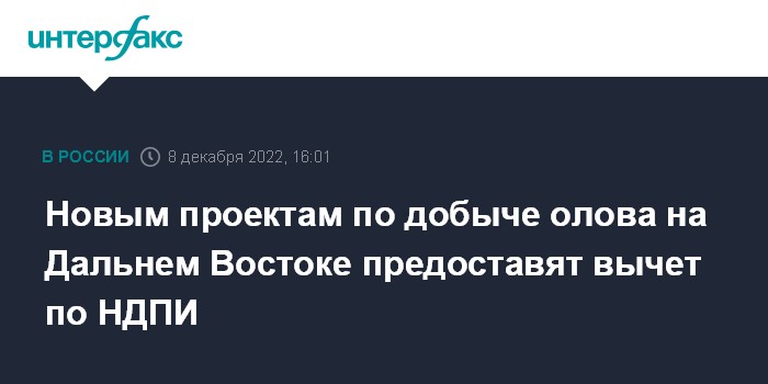 Москва. 8 декабря. INTERFAX.RU - Госдума приняла в первом чтении законопроект, который с 1 января 2023 года по 31 декабря 2032 года предоставляет налоговый вычет по НДПИ проектам по добыче олова в Дальневосточном федеральном округе (ДФО), при этом нововведение коснется только новых проектов.