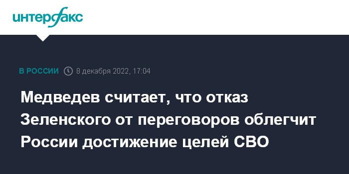 Москва. 8 декабря. INTERFAX.RU - Отказ президента Украины Владимира Зеленского от мирных переговоров с Россией позволит Москве добиться целей специальной военной операции, не ограничивая себя ненужными ей компромиссами с Киевом, считает заместитель председателя Совбеза РФ Дмитрий Медведев.