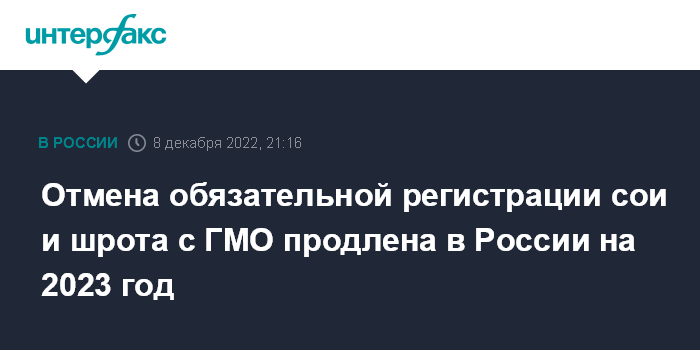 Отмена госрегистрации сои и соевого шрота с ГМО, поставки которых возможны при условии подтверждения их безопасности Россельхознадзором, была предусмотрена постановлением правительства от 16 апреля 2020 года. Срок его действия был сначала рассчитан до 1 января 2021 года, затем ежегодно продлевался.