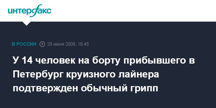 Москва. 29 июня. INTERFAX.RU - Экспресс-тесты, проведенные с членами экипажа и пассажирами прибывшего в Петербург круизного лайнера Emerald Princess, вывили у 14 человек обычный грипп, сообщил журналистам заместитель начальника Управления Роспотребнадзора по Петербургу Дмитрий Курнаев в понедельник. Вместе с тем специалисты пока не могут сказать, имеется ли у кого-либо из заболевших гриппом А вирус разновидностью H1N1.