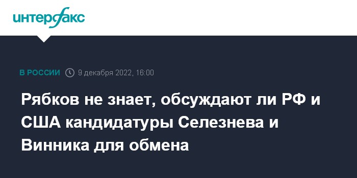 Москва. 9 декабря. INTERFAX.RU - Замглавы МИД Сергей Рябков заявил, что не знает, обсуждаются кандидатуры россиян Романа Селезнева и Алексея Винника в качестве потенциальных участников обмена.