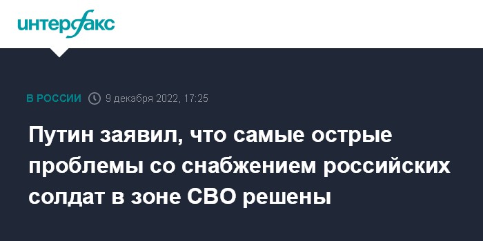 Москва. 9 декабря. INTERFAX.RU - Вопросы со снабжением российских солдат в зоне специальной военной операции на Украине остаются, но наиболее острые - уже решены, заявил президент РФ Владимир Путин.