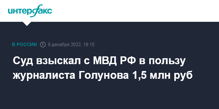 Москва. 9 декабря. INTERFAX.RU - Мосгорсуд взыскал 1,5 млн руб. по иску журналиста Ивана Голунова, незаконно обвинявшегося в покушении на сбыт наркотиков, к МВД РФ о возмещении морального вреда, сообщили "Интерфаксу" в пресс-службе суда.