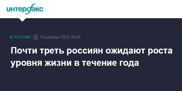 Москва. 10 декабря. INTERFAX.RU - Почти каждый третий россиянин (30%) полагает, что в течение ближайшего года его уровень жизни станет выше, свидетельствуют данные опроса Фонда "Общественное мнение" (ФОМ), опубликованные на официальном сайте социологического центра.