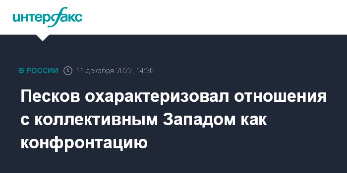 Москва. 11 декабря. INTERFAX.RU - Пресс-секретарь президента России Дмитрий Песков заявил, что отношения с коллективным Западом фактически заморожены, и охарактеризовал их как конфронтацию.
