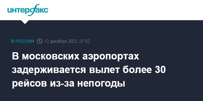 Москва. 12 декабря. INTERFAX.RU - В Московских аэропортах задержан 31 авиарейс - по данным сервиса "Яндекс. Расписание" на 07:30 (по Москве), вылеты задерживаются на фоне дождя и снегопада - в Москве в выходные был сильный снегопад, который сменился сильным дождем.