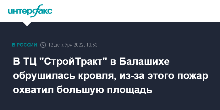 Москва. 12 декабря. INTERFAX.RU - Обрушение кровли ТЦ "СтройТракт" в Балашихе спровоцировало распространение огня на большую площадь, сообщили "Интерфаксу" в пресс-службе МЧС России в понедельник.