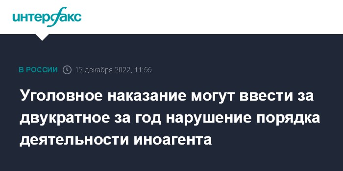 Москва. 12 декабря. INTERFAX.RU - Уголовное наказание в виде штрафов или лишения свободы будет применяться после двукратного в течение года административного нарушения порядка деятельности иностранного агента, предусматривают поправки, одобренные в понедельник на заседании комитета Госдумы по госстроительству и законодательству.