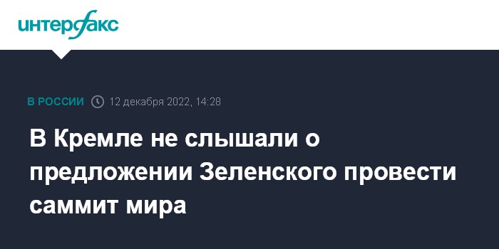 "Нет, ничего не слышали, и нам, собственно, ничего неизвестно о миротворчестве президента Зеленского", - сказал Песков на просьбу журналистов прокомментировать предложение Зеленского провести "глобальный саммита мира".