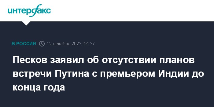 Москва. 12 декабря. INTERFAX.RU - Пресс-секретарь президента РФ Дмитрий опроверг информацию СМИ о том, что премьер Индии Нарендра Моди отказался от встречи с президентом России Владимиром Путиным до конца года из-за его заявлений о возможности применения ядерного оружия.