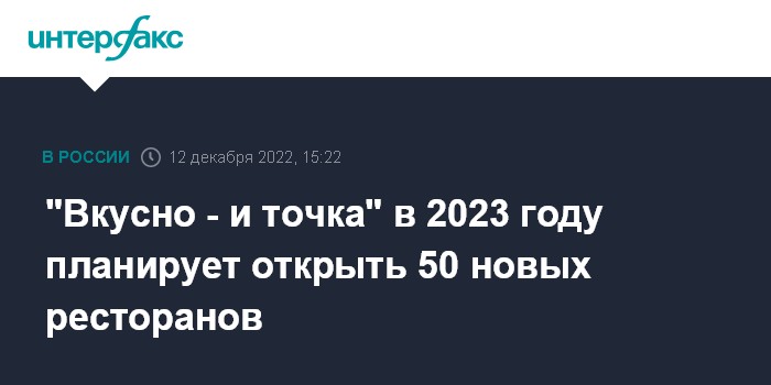 Москва. 12 декабря. INTERFAX.RU - Сеть ресторанов "Вкусно - и точка" планирует в 2023 году открыть 50 новых ресторанов, на сегодня в сети их насчитывается 840, сообщил "Интерфаксу" владелец сети Александр Говор.