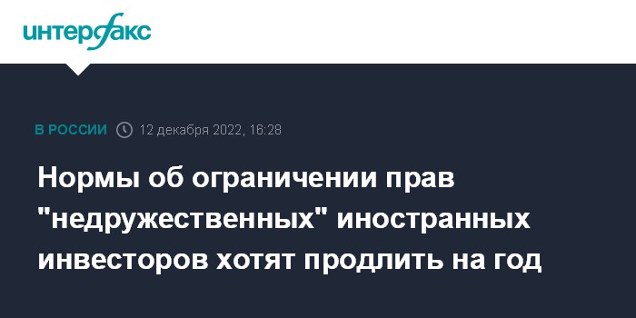 Нормы об ограничении прав "недружественных" иностранных инвесторов хотят продлить на год