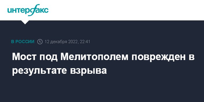 Москва. 12 декабря. INTERFAX.RU - Под Мелитополем в Запорожской области произошел взрыв, повреждены опоры моста, сообщили в администрации области.