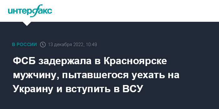 Москва. 13 декабря. INTERFAX.RU - ФСБ сообщила о задержании в аэропорту Красноярска мужчины, пытавшегося уехать из страны и вступить в ряды украинской армии.