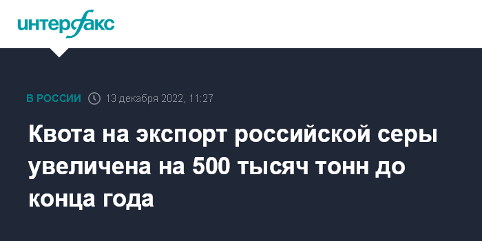 Москва. 13 декабря. INTERFAX.RU - Правительство увеличило действующую до конца 2022 года квоту на экспорт серы на 500 тысяч тонн - до 1,6 млн тонн. Такое постановление подписал премьер-министр Михаил Мишустин, сообщает сайт правительства.