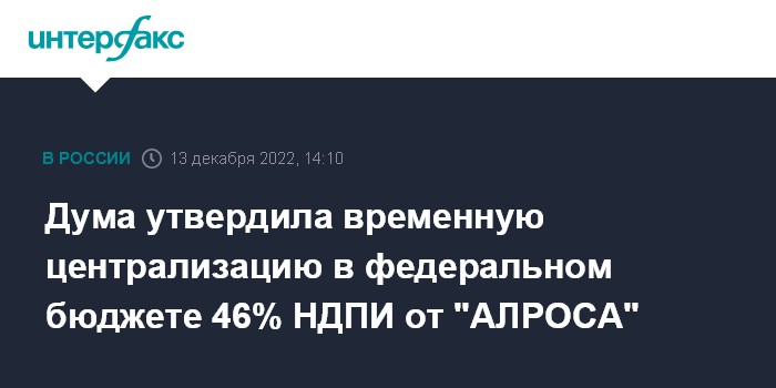 Москва. 13 декабря. INTERFAX.RU - Госдума приняла в третьем чтении закон, который на два месяца, вводит централизацию в федеральном бюджете 46% от НДПИ, который уплачивает АК "АЛРОСА", при этом в региональные бюджеты будет уплачиваться 54% от НДПИ; сейчас 100% НДПИ уплачивается в бюджет Якутии.